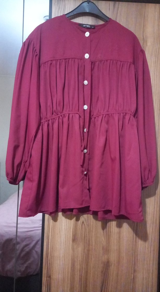 Bordo renk, uzun kollu, düğmeli ve yüksek yakalı Rahat kesimli, midi boy ve yumuşak keten kumaştan üretilmiştir.