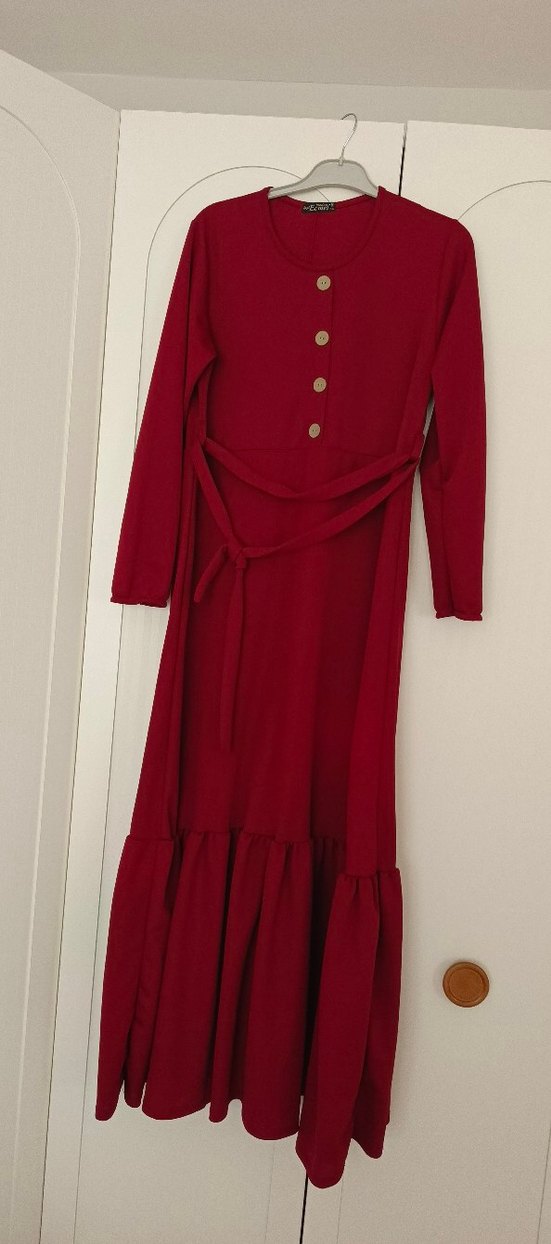 Düğmeli Bordo Uzun Kadın Elbise