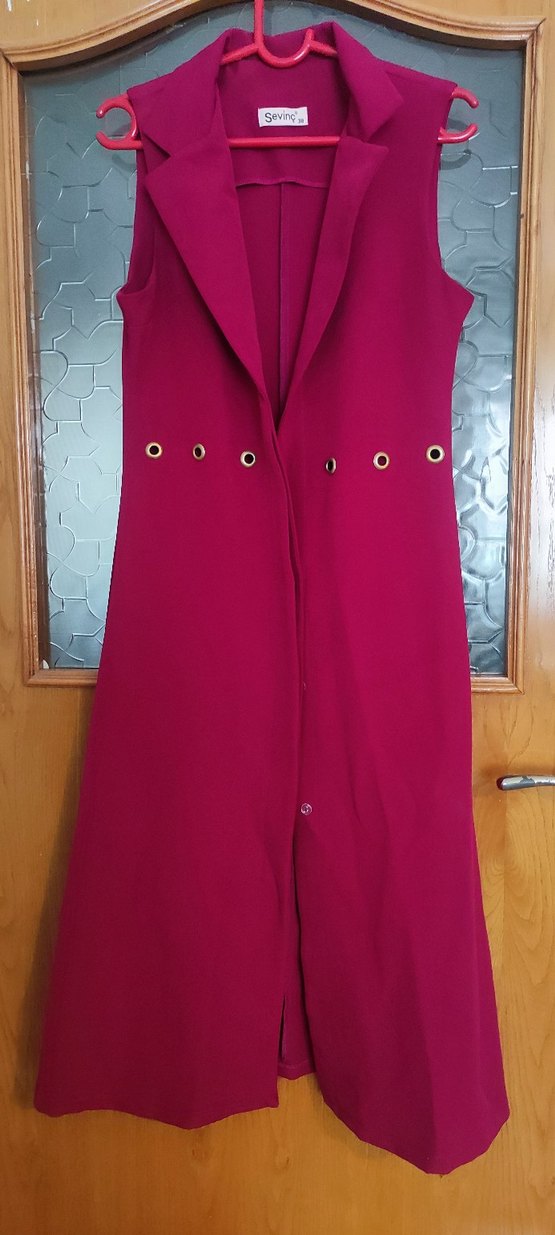Düğmeli ve çıtçıtlı, yakalı bordo uzun yelek. Kolsuz, rahat kesim, yumuşak ve sıcak kumaştan üretilmiştir. Günlük kullanıma uygun.