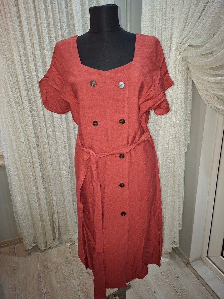 Bu bordo uzun keten elbise, düğmeli ön detay, kısa kollu ve yakası kesik detaylıdır. Bohem vintage tarzda, günlük kullanıma uygundur. Kumaşı çok güzel .1 kez giyildi.
