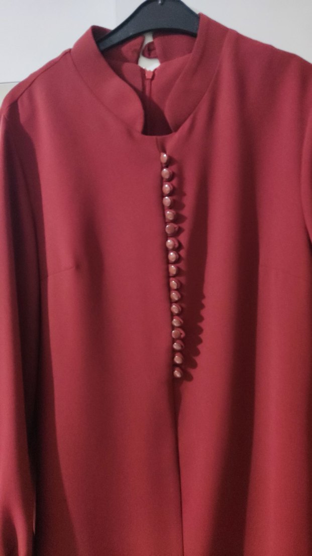 Bordo renkli, düğmeli, uzun kollu, uzun kesim ve bol fitli hamile tunik. Satenimsi dokusu ve yuvarlak yaka ile romantik akşamlar için uygun. ✨