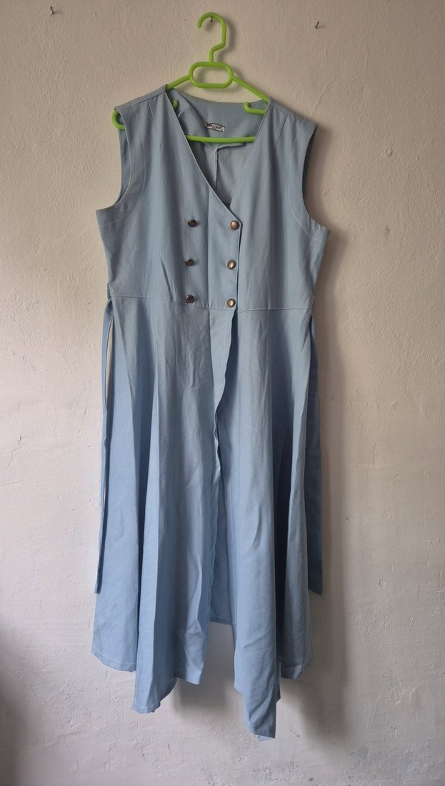 Düğmeli, uzun keten hamile elbisesi. Pastel mavi renkte, yakası kesimli ve kolsuzdur. Günlük kullanım için vintage tarzda, rahat kesimlidir.