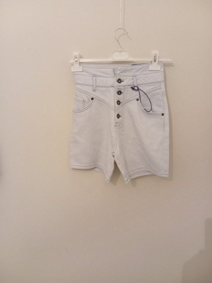 Düğmeli buzul mavi kot şort, bol kesim ve günlük rahat kullanıma uygun. Sokak stili için ideal, trend görünüm sunar.