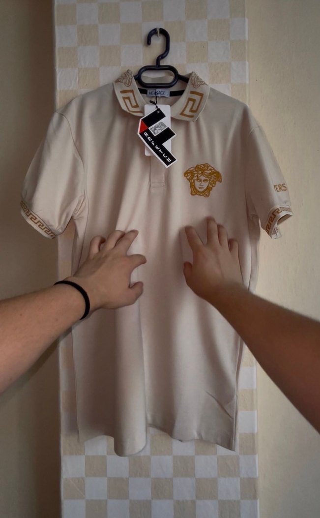 Düğmeli, kısa kollu, krem erkek polo tişört. Baskılı detayları ve sentetik, yumuşak kumaşıyla gündelik stil için uygundur.