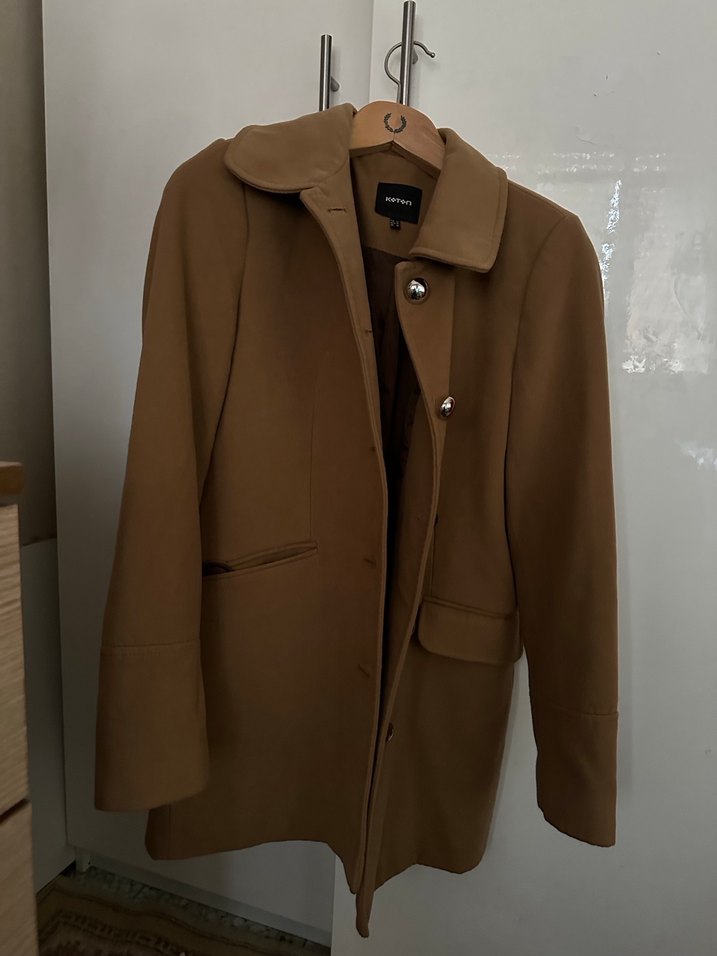 Yumuşak kumaşlı camel renk kaban, klasik yaka ve düğmeli kapama detayına sahiptir. Cepleri ve şık kesimi bulunur.