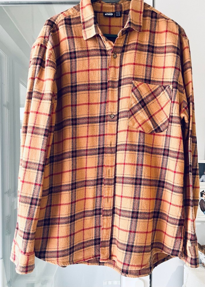 Düğmeli, uzun kollu, yakalı, bol kesim erkek gömlek. Camel kareli desenli ve ön cep detaylı, günlük rahat kullanım için uygundur.