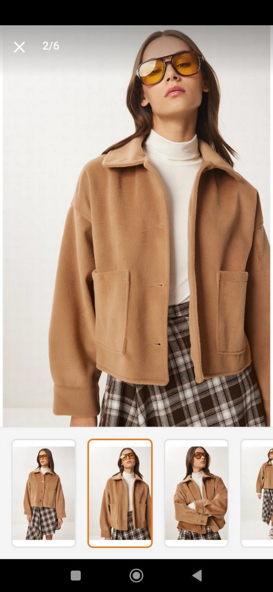 Camel renkli, düğmeli mini kadın ceket, geniş kesim, uzun kollu ve kesik yakalıdır. Önünde iki cep bulunur, yumuşak ve sıcak kumaştan yapılmıştır.