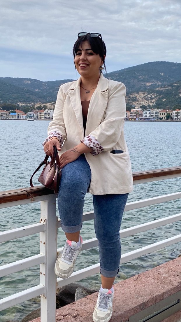 Camel renkli denim blazer, düğmeli ve yaka kısmı kesik detaylıdır. Uzun kollu ve manşetleri tie-dye desenlidir, günlük şıklık için uygundur. Butikten alındı keten kumaşlı içi leopar desen astar