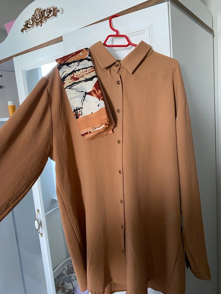 Düğmeli, yakalı, uzun kollu ve bol kesim camel renkli gömlek. Parlak dokusu ve desenli eşarp ile tamamlanır.