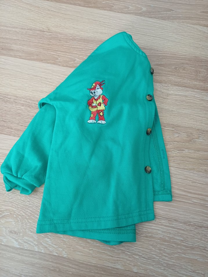Düğmeli, uzun kollu, turkuaz renkli ceket. Gevşek kesim ve yuvarlak yaka, yumuşak ve sıcak kumaştan üretilmiştir.
