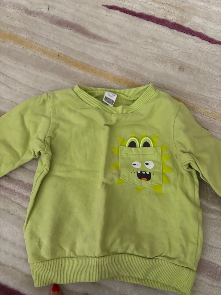 Uzun kollu, yuvarlak yakalı ve bol kesim yeşil erkek sweatshirt. Yumuşak ve sıcak kumaştan, renkli baskılı ve düğmeli cep detaylıdır.