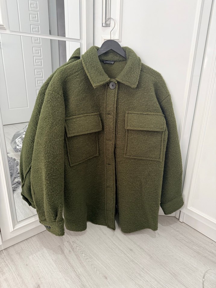 Düğmeli, cep detaylı, yakalı ve uzun kollu asker yeşili renk midi boy bol kesim kaban. Yumuşak ve sıcak kumaştan üretilmiştir.