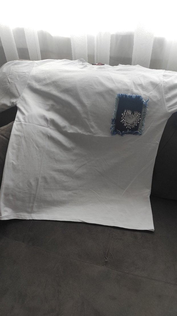 Beyaz renkte, kısa kollu ve yuvarlak yakalı tişört Düğmeli ve baskılı kot cep detayıyla günlük sokak stiline uygun.