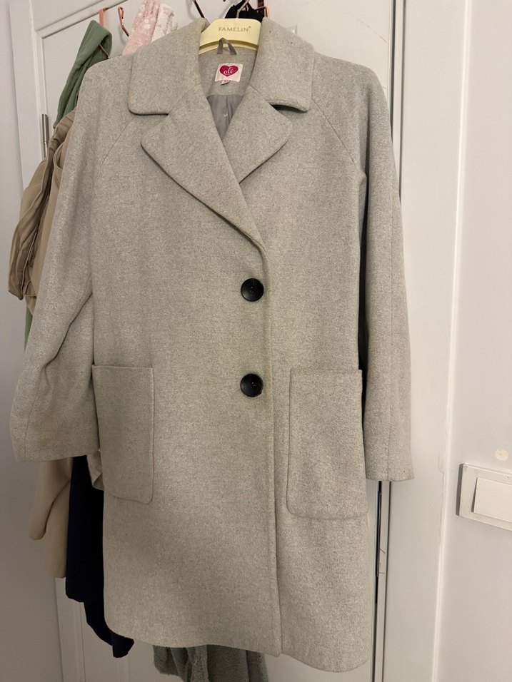 Geniş yakalı, önünde büyük cepler ve iki siyah düğmeli oversize kaban. 36 bedene de rahatlıkla olur.