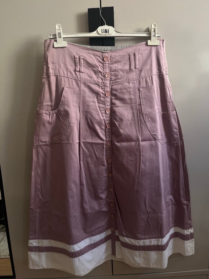 Lila renkte, düğmeli ve cepli, bol kesim bohem tarzında günlük kullanıma uygun etek.