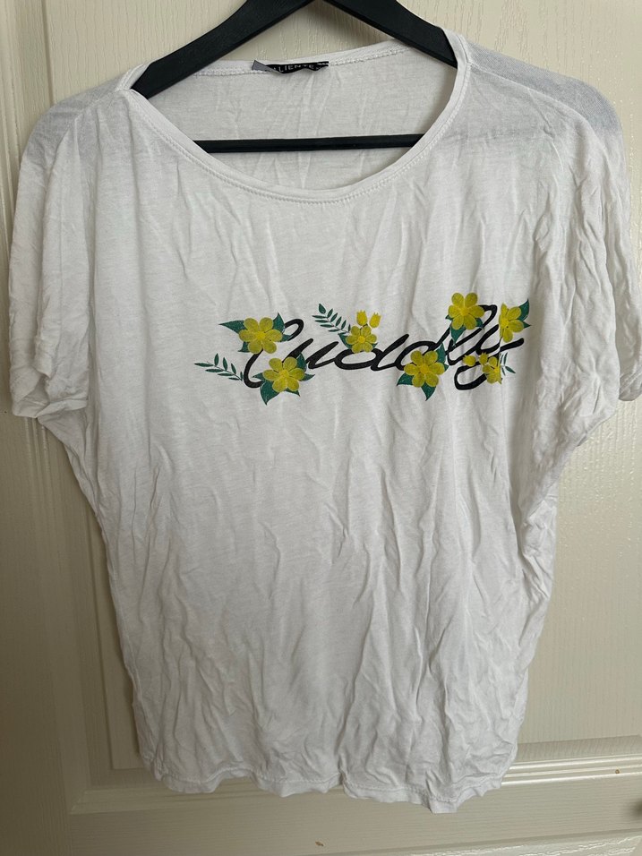 Pamuklu kumaştan yapılmış, düğmeli ve çiçek baskılı beyaz tişört. Kısa kollu, yuvarlak yakalı ve rahat kesimlidir. Günlük sokak stili için uygundur.