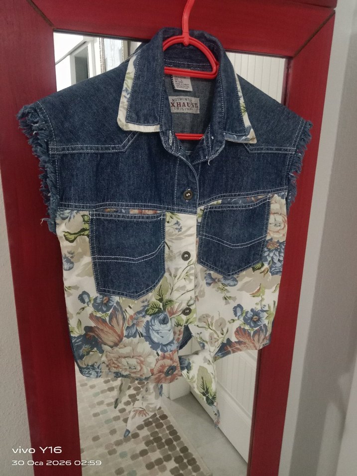 Düğmeli, çiçek desenli kot gömlek. Kolsuz, kısa ve dar kesim. Vintage ve bohem tarzları birleştirir.