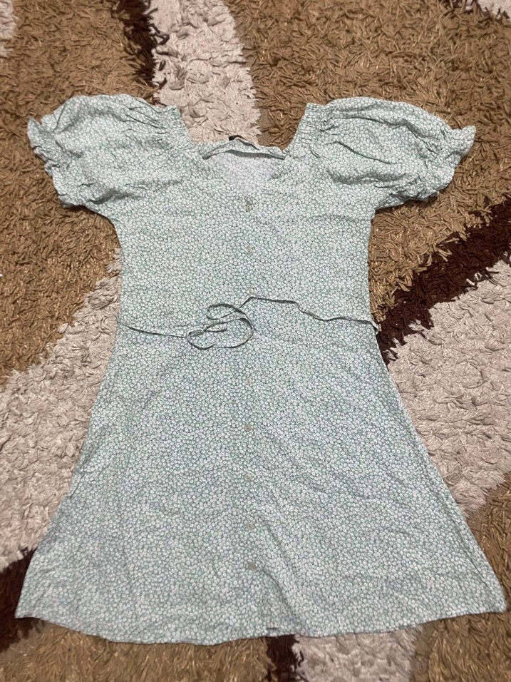 Su yeşili çiçek desenli, kısa balon kollu ve düğmeli midi elbise. V yaka ve kemer detaylı, yumuşak sentetik kumaştan rahat bir bohem tarz sunar.