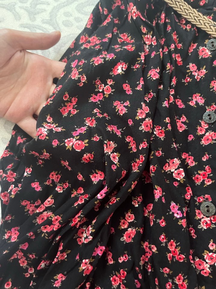 Yumuşak sentetik kumaştan, koyu pembe çiçek desenli, düğmeli, bol kesim midi eteği. Bohem tarz için uygundur.