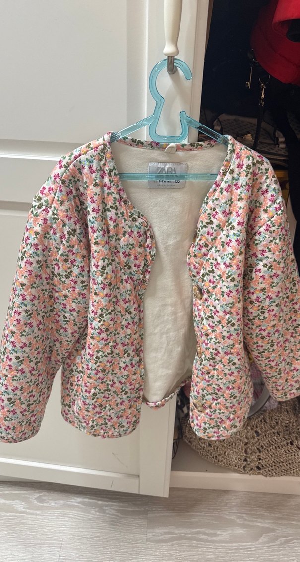 Düğmeli, pamuklu, bol kesim kız ceketi. Beyaz zemin üzerine pastel çiçekli desen ve kesik yaka ile bohem tarzını yansıtır.