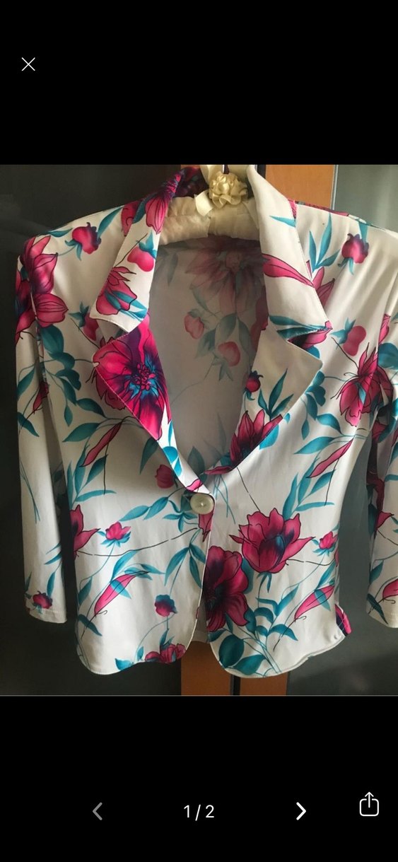 Düğmeli, yakalı ve uzun kollu bu pembe çiçek desenli kadın ceket, likralı kumaştan yapılmış ve vintage bohem tarzı sunar.