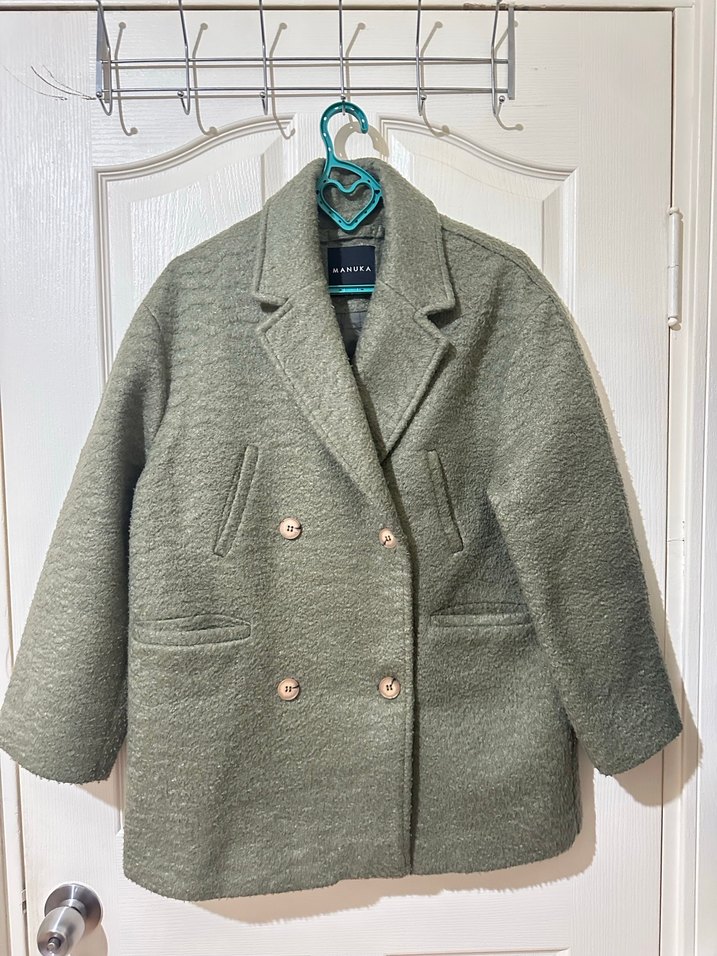 Yumuşak dokulu, çift düğmeli haki kaban, iki ön cepli, sıcak tutar.