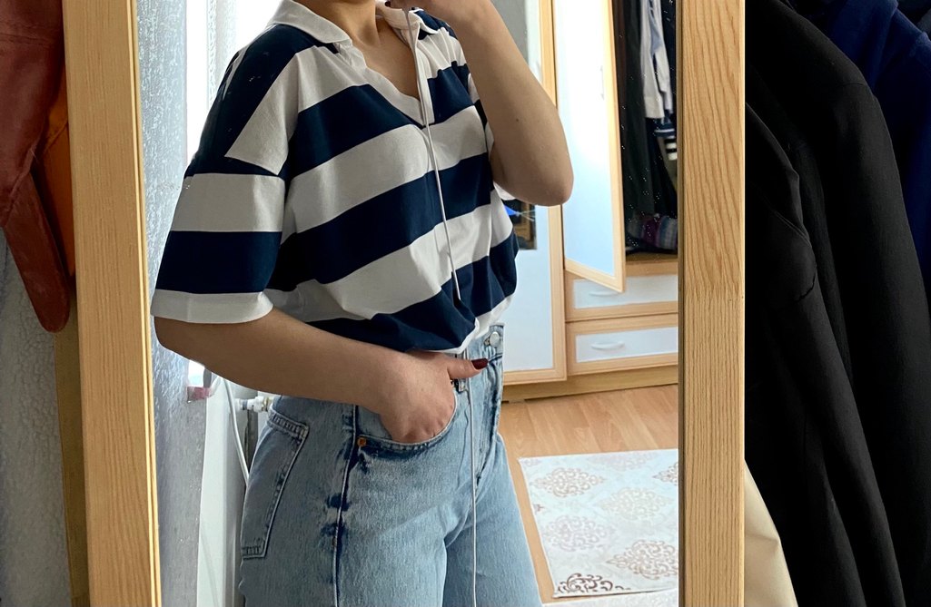 Açık mavi kot pantolon, bol kesimli ve düğmeli. Çizgili deseniyle günlük kullanıma uygun, normcore tarzda kadın pantolonu.