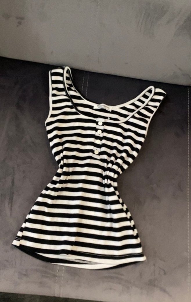 Düğmeli, çizgili, pamuklu atlet. Kolsuz, kayık yaka ve rahat kesimli, şık ve gündelik tarzda.
