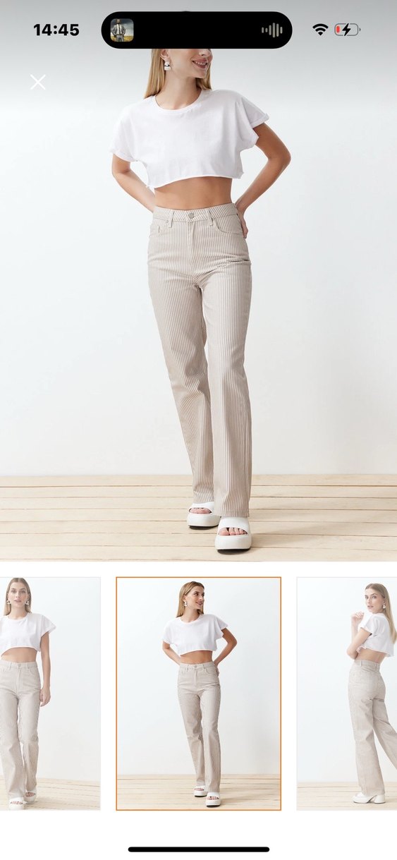 Düğmeli, çizgili, bej renkli pamuklu kadın jean. Regular fit ve midi boy, günlük sokak stili için uygundur. Kilo aldığım için iki kez bile giyemedim nefes alamıyorum mlsf.