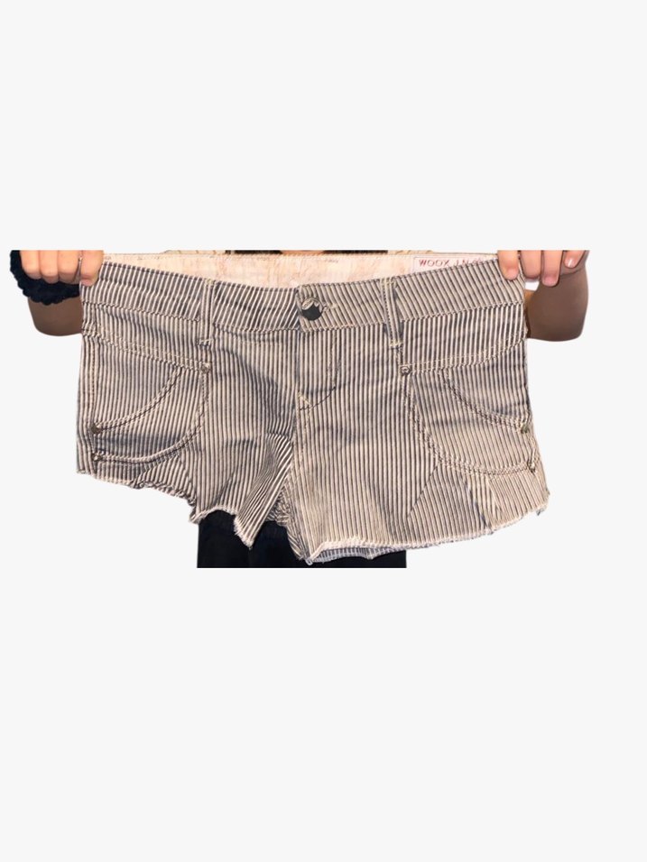 Düğmeli kapama ve çizgili desene sahip, bej renkli, kot kumaştan yapılmış, dar kesim düşük bel mini şort.