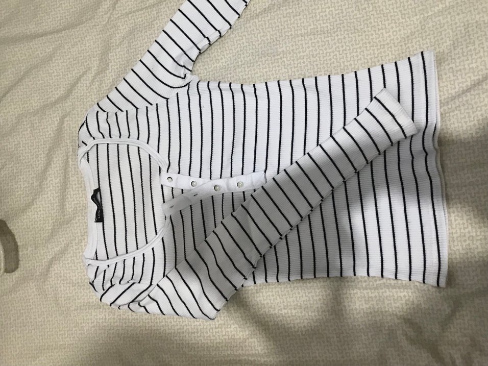 Uzun kollu, düğmeli, çizgili, vücuda oturan triko body.