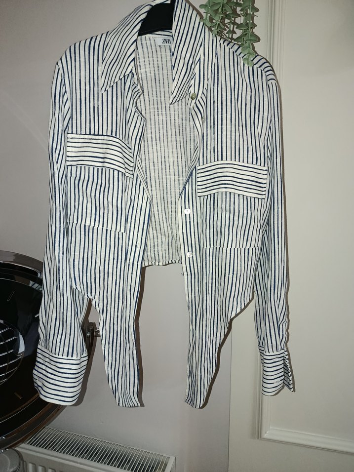 Bu bol kesim kadın gömlek, uzun kollu ve düğmeli yakaya sahiptir. Beyaz ve gri çizgili denim kumaştan üretilmiş olup, günlük kullanıma uygun rahat bir sokak stili sunar. Midi boy ve Paris tarzı ile trend bir görünüme sahiptir.
