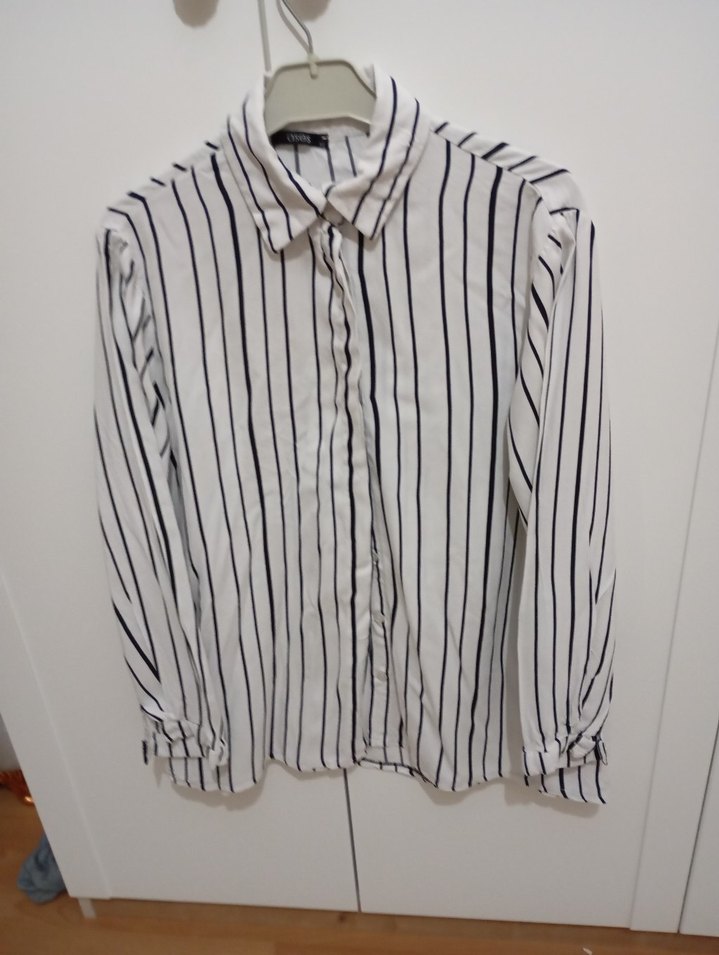 Uzun kollu, düğmeli ve yakalı kadın gömleği. Beyaz ve gri çizgili, normal boyda ve rahat kesim. Yumuşak sentetik kumaştan üretilmiştir.