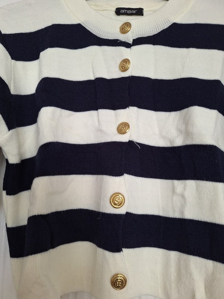 Pamuklu, uzun kollu ve yuvarlak yaka kadın hırka. Beyaz ve siyah parlak çizgilerle, düğmeli ve salaş kesim. Günlük rahat stil için uygundur.sıfır üründür hiç giyilmedi