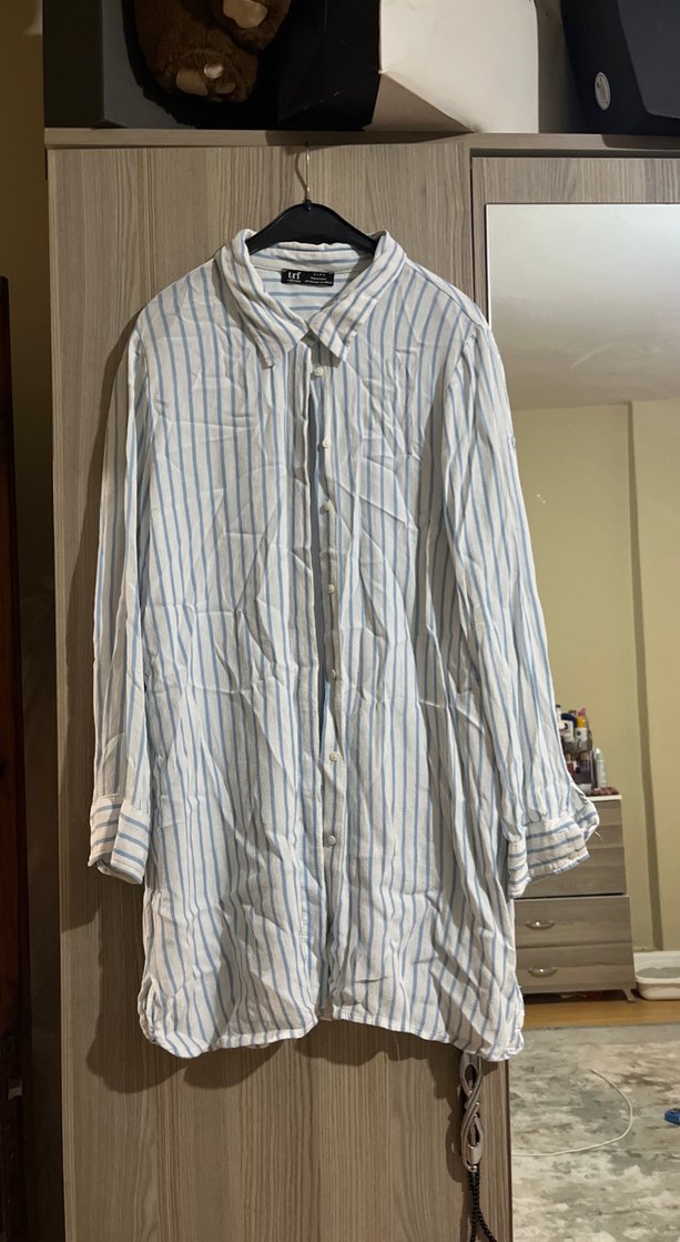 Uzun kollu, yakalı ve düğmeli beyaz mavi gömlek, hafif çizgili desene sahip. Rahat kesimi ve günlük sokak stili için uygundur. Zara marka 50 cm iki kol arası tunık boy 78 cm