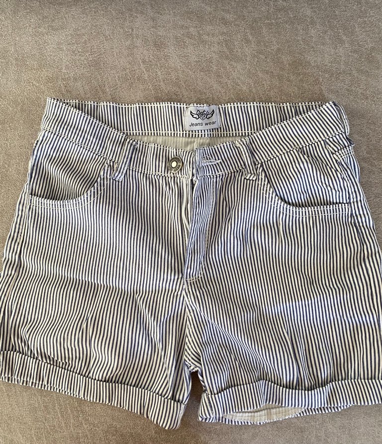 Çizgili desene sahip, düğmeli beyaz mini denim şort, rahat ve sokak tarzı için uygundur.