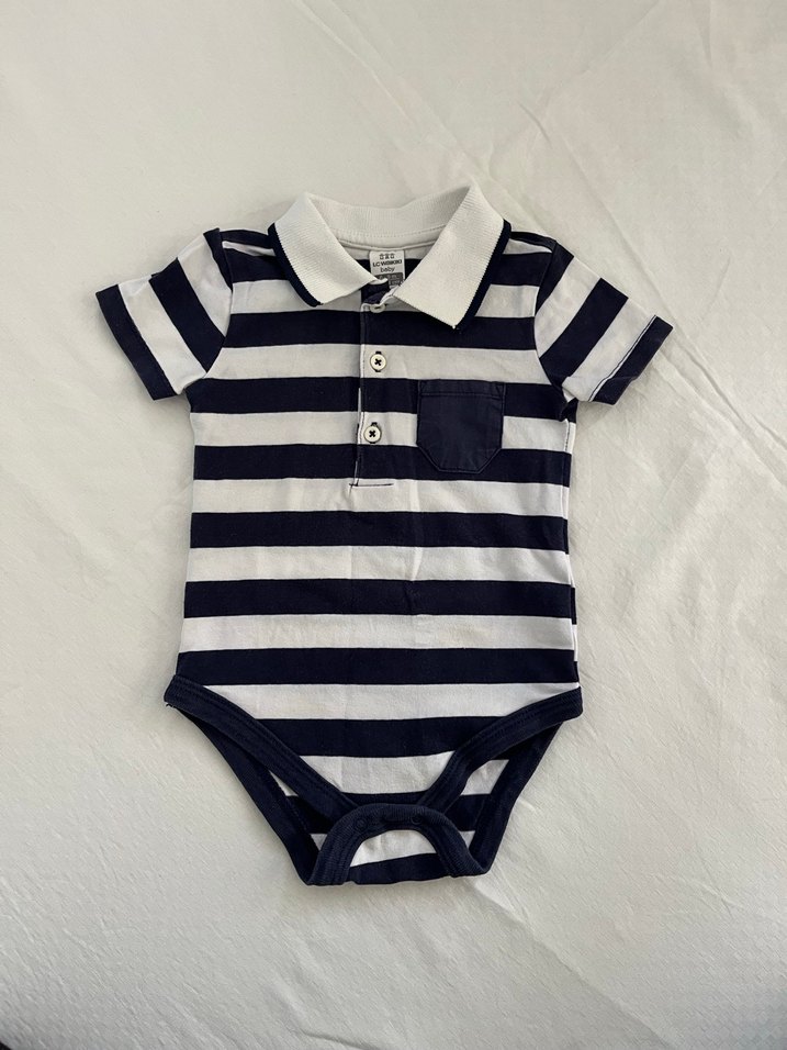 Düğmeli, kısa kollu, yakalı bu erkek bebek body'si yumuşak pamuktan üretilmiş, koyu ve beyaz çizgili desenlidir. Sokak stiline uygundur.