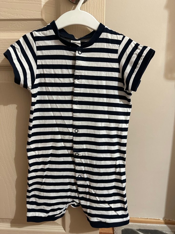 Bu erkek bebek tulumu kısa kollu, düğmeli ve yakalıdır. Yumuşak pamuktan yapılmış, gri ve koyu çizgili sokak tarzına uygundur.