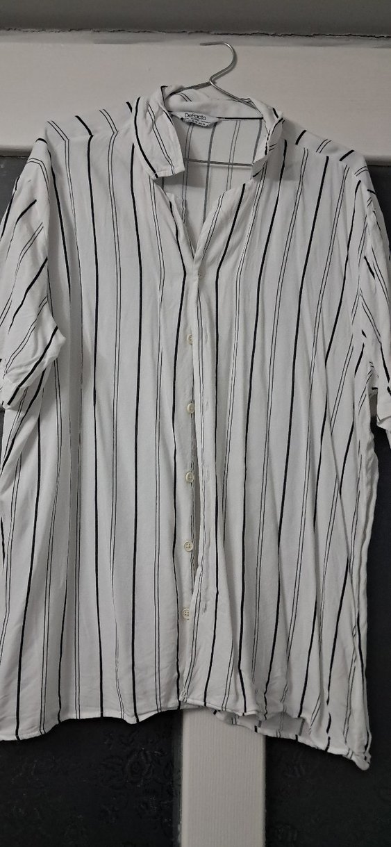Bu kadın erkek, düğmeli ve kısa kolludur. kumaştan, beyaz zemin üzerinde gri çizgilidir ve boydadır. Rahat kesimiyle günlük sokak stiline uygundur.