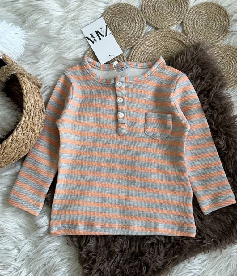 Uzun kollu, yuvarlak yaka ve düğmeli erkek çocuk bluz. Rahat kesim, çizgili triko kumaş ve küçük göğüs cebi bulunur. Günlük kullanıma uygundur. 5-6 yaş.