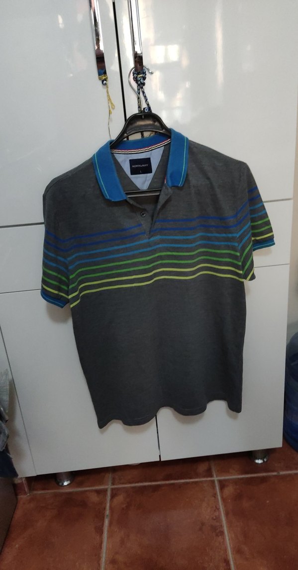 Gri renkte, düğmeli yaka ve kısa kollu erkek polo tişört. Sentetik kumaştan üretilmiş, çizgili desenli ve regular fit kesime sahip.