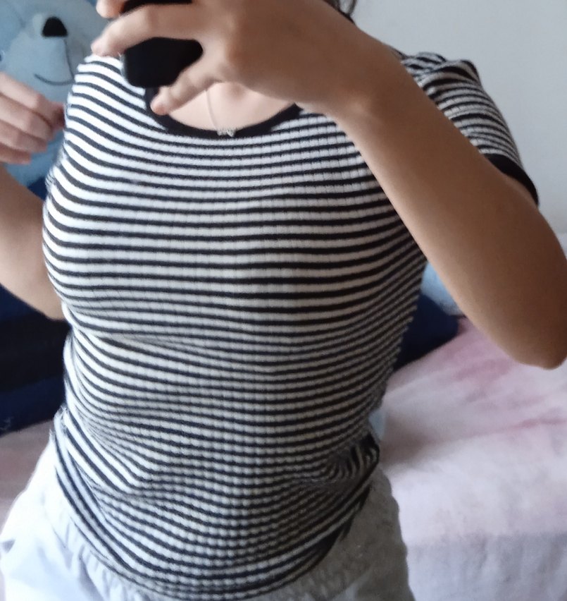 Pamuk kumaştan yapılmış, düğmeli ve çizgili desene sahip, kısa kollu, bisiklet yaka, gri renkte, normal boyda ve dar kesim hamile tişörtü.
