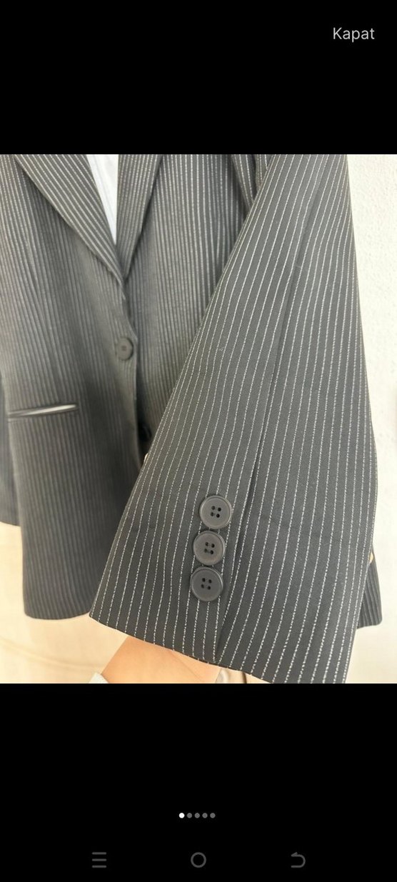 Gri renkli, düğmeli, çentikli yakalı kadın blazer. Uzun kollu, manşetlerinde üç düğme ve çizgili desene sahip. Sentetik kumaştan, normal boy, iş ortamı için uygun.