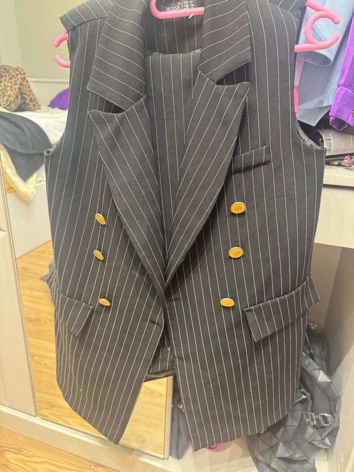 Düğmeli ön cep detaylı, çizgili gri kadın yelek, notched yaka ve regular fit ile ofis ve günlük kullanıma uygundur.