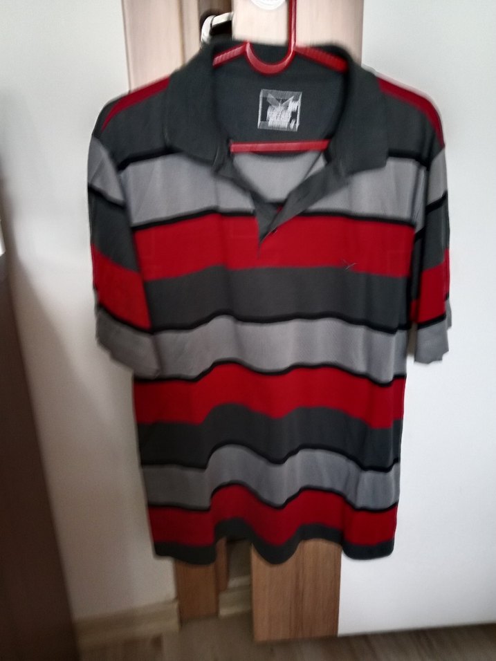 Düğmeli, kısa kollu, yakalı ve bol kesim erkek polo tişört. Gri ve kırmızı yatay çizgili, sentetik kumaştan, günlük rahat sokak stili için uygundur.
