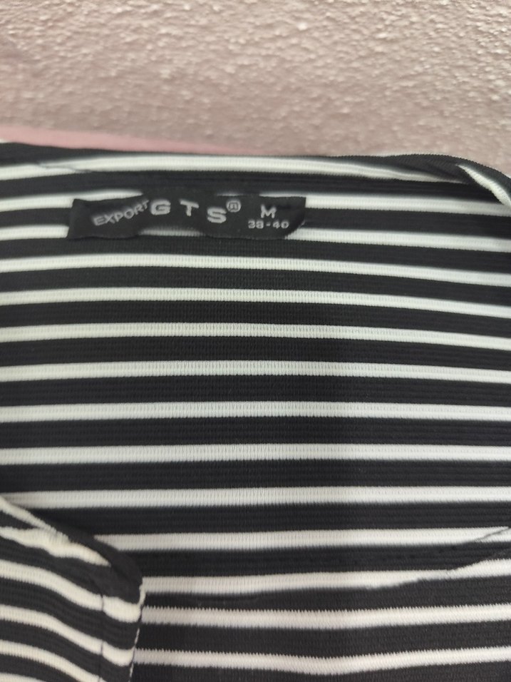 Düğmeli ve askılı kollu, balıkçı yaka çizgili hamile bluzu. Gri renkli, sentetik kumaştan, günlük kullanıma uygun.