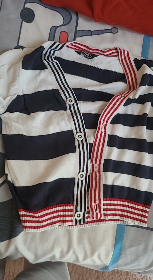 Düğmeli, V yakalı, çizgili ve beyaz-gri renkli hamile hırkası. Sentetik kumaştan, günlük kullanıma uygun şık bir sokak stili ürünü.