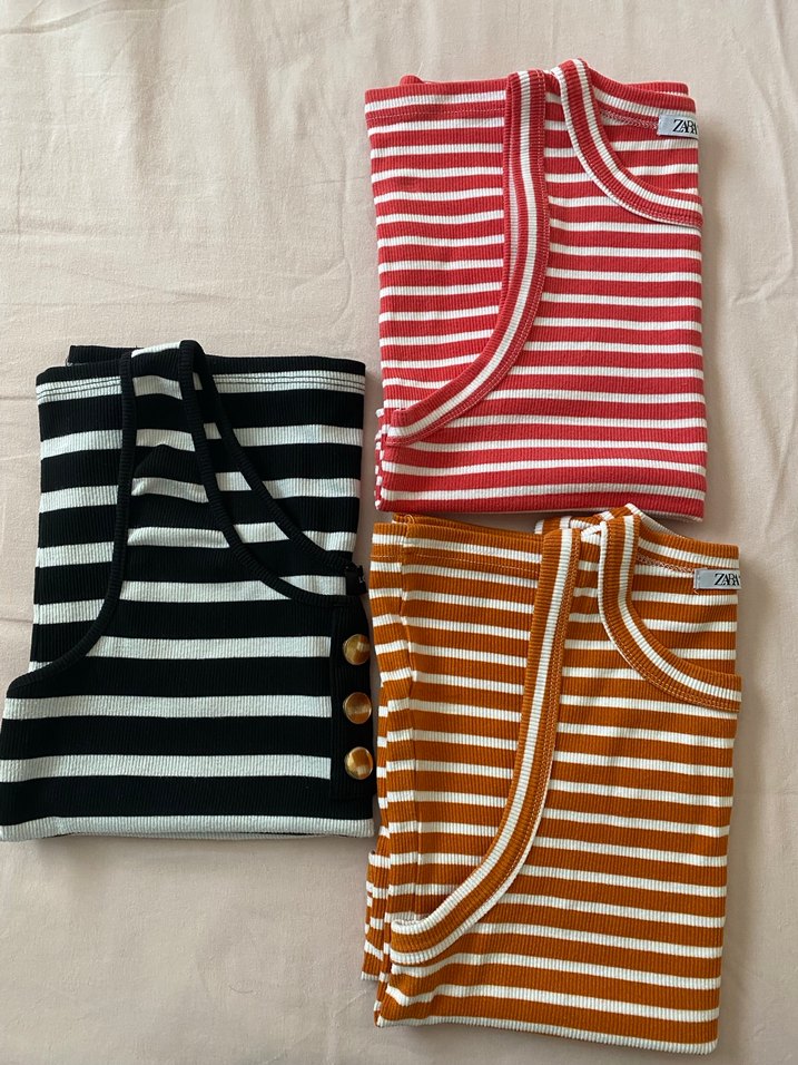Düğmeli, ince çizgili, vücuda oturan kadın atletler. Kolsuz, yuvarlak yaka ve yumuşak tekstil kumaştan, günlük sokak stiline uygun.