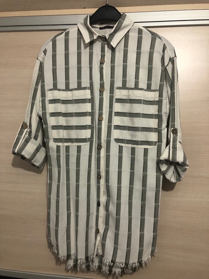 Uzun kollu, düğmeli ve çizgili kadın gömleği. Regular kesim, iki cep ve püsküllü midi boy ile günlük rahat stil için uygundur.
