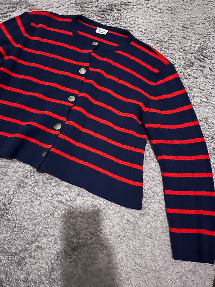 Kadın hırka, uzun kollu ve yuvarlak yaka, yumuşak triko kumaştan, bol kesim. Kırmızı ve gri çizgili desenli, düğmeli, günlük sokak stili için uygundur.